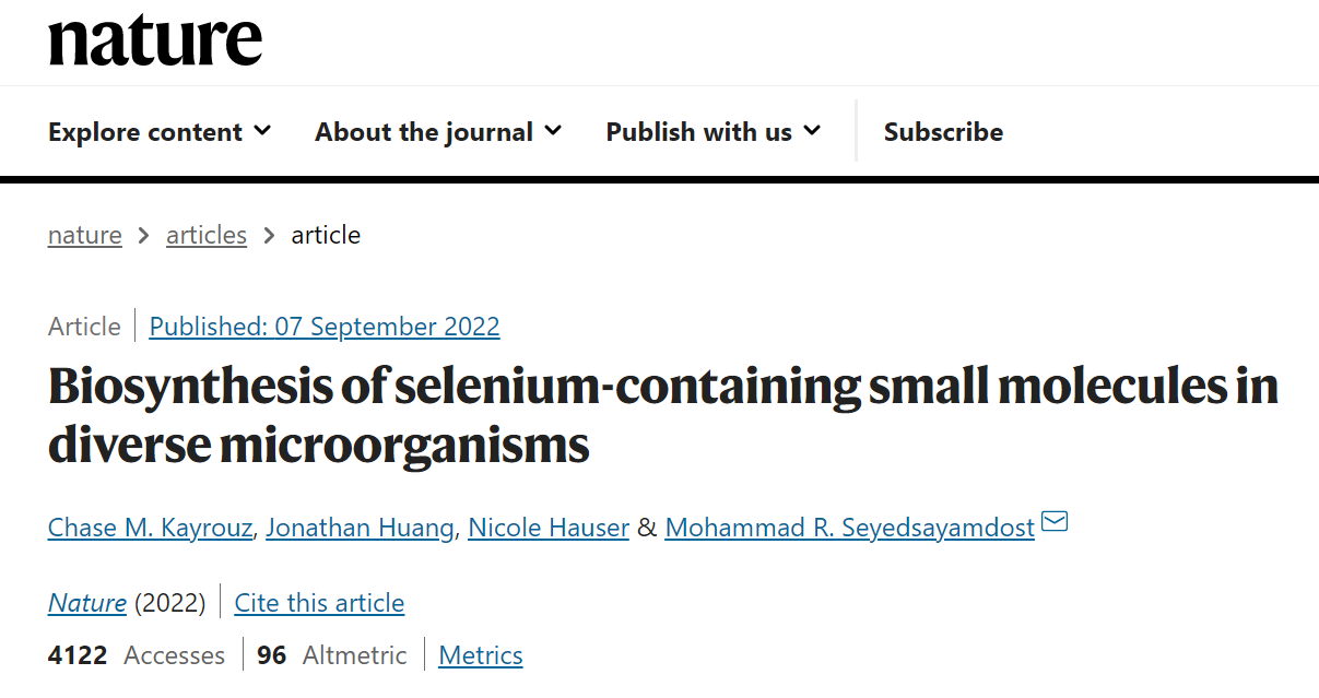 在一項(xiàng)新的研究中,來(lái)自美國(guó)普林斯頓大學(xué)的研究人員發(fā)現(xiàn)了將硒整合到微生物小分子中的生物合成途徑,這標(biāo)志著率先在天然產(chǎn)物中發(fā)現(xiàn)了這種原子,為硒生物學(xué)開(kāi)辟了一條新途徑。這一發(fā)現(xiàn)也有力地表明,硒是所有生命王國(guó)的重要微量元素,它在細(xì)菌中的生物功能可能比科學(xué)家初假設(shè)的更重要。相關(guān)研究成果于2022年9月7日在線發(fā)表在《自然》雜志上,題目為“微生物中含硒小分子的生物合成”。這篇論文的作者是普林斯頓大學(xué)化學(xué)教授Mohammad Seyedsayamdost博士。