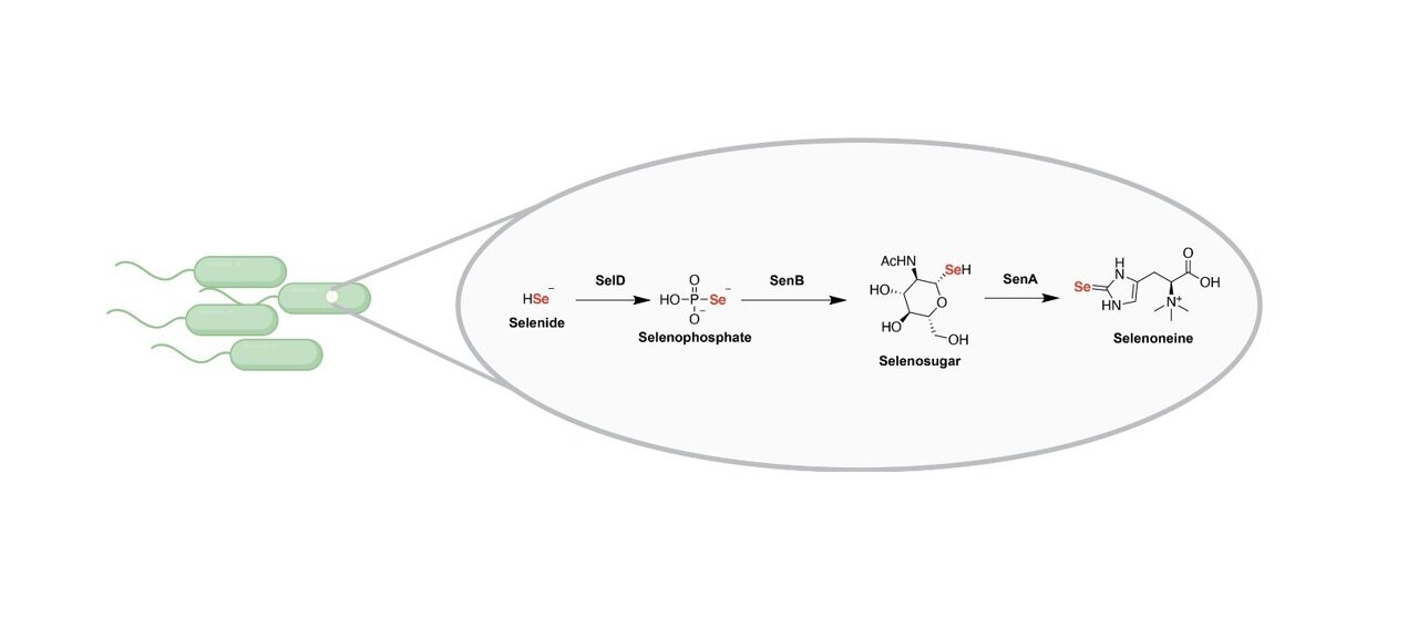 硒是多種生物必需的微量元素。已知有兩種途徑可將其插入蛋白質(zhì)和核酸,分別是通過(guò)硒半胱氨酸和2-硒尿啶。然而,盡管硒的重要性,具體結(jié)合到小分子的途徑仍然是未知的。在這里,我們使用基因組挖掘策略,在各種微生物中發(fā)現(xiàn)了一個(gè)廣泛的三基因集群,編碼產(chǎn)生硒氨酸的途徑,硒氨酸是多功能分子麥角硫氨酸的硒類似物。我們闡明了所有三種蛋白質(zhì)的反應(yīng),并發(fā)現(xiàn)了兩種新的硒碳鍵形成酶和生產(chǎn)硒糖的生物合成途徑,這是一個(gè)意想不到的中間產(chǎn)物到終產(chǎn)品。我們的發(fā)現(xiàn)擴(kuò)大了生物硒利用的范圍,表明硒代謝組比以前認(rèn)為的更多樣化,并為發(fā)現(xiàn)其他含硒天然產(chǎn)物奠定了基礎(chǔ)。